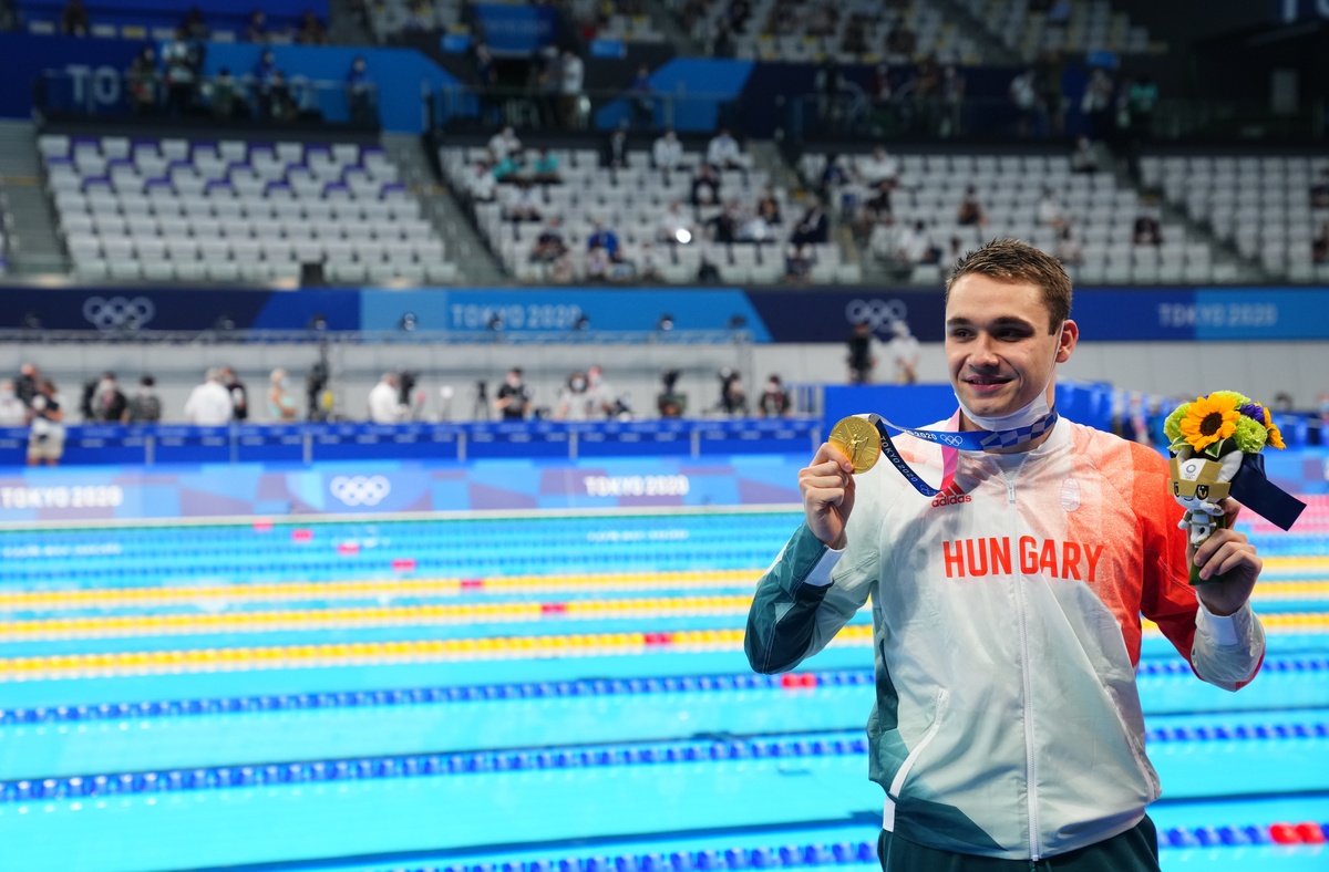 World record holder Kristof Milak of Hungary powered to the men's butterfly 200m gold, despite being forced into a last-minute change of swimming trunks.