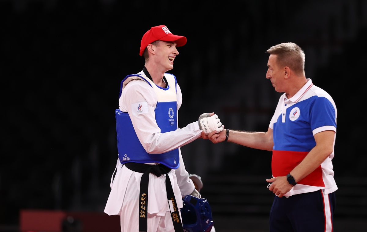 Tokyo 2020 Olympics - Taekwondo - Men's Welterweight 68-80kg - Gold medal match - Makuhari Messe Hall A, Chiba, Japan - July 26, 2021. Maksim Khramtcov of the Russian Olympic Committee celebrates winning gold with coach REUTERS/Murad Sezer