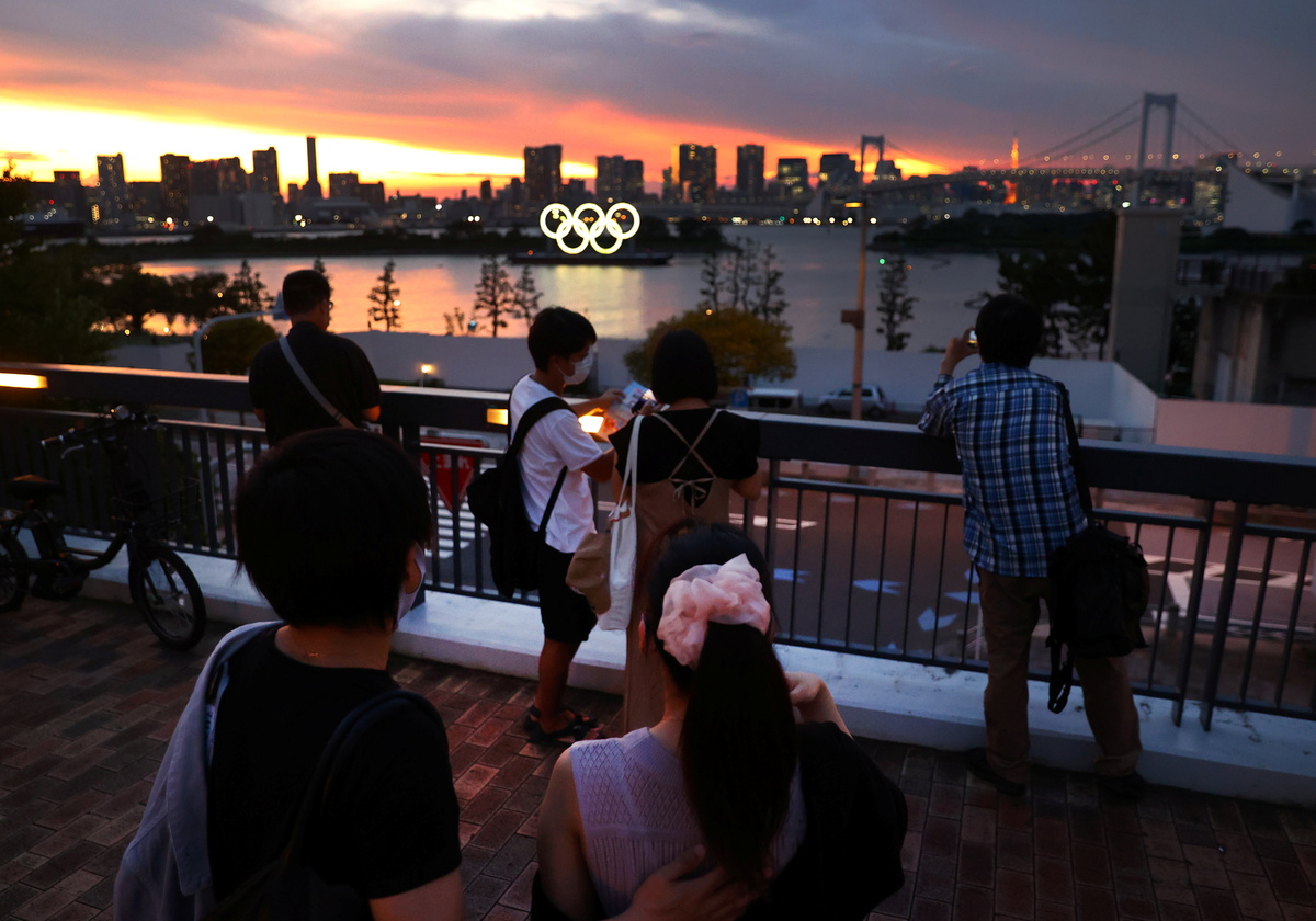 In the skies above Tokyo, Japanese pilots drew the five Olympic rings in a practice flight for Friday's opening ceremony, recreating a similar stunt at the 1964 Tokyo Games, which were held to highlight the country's recovery from World War Two.