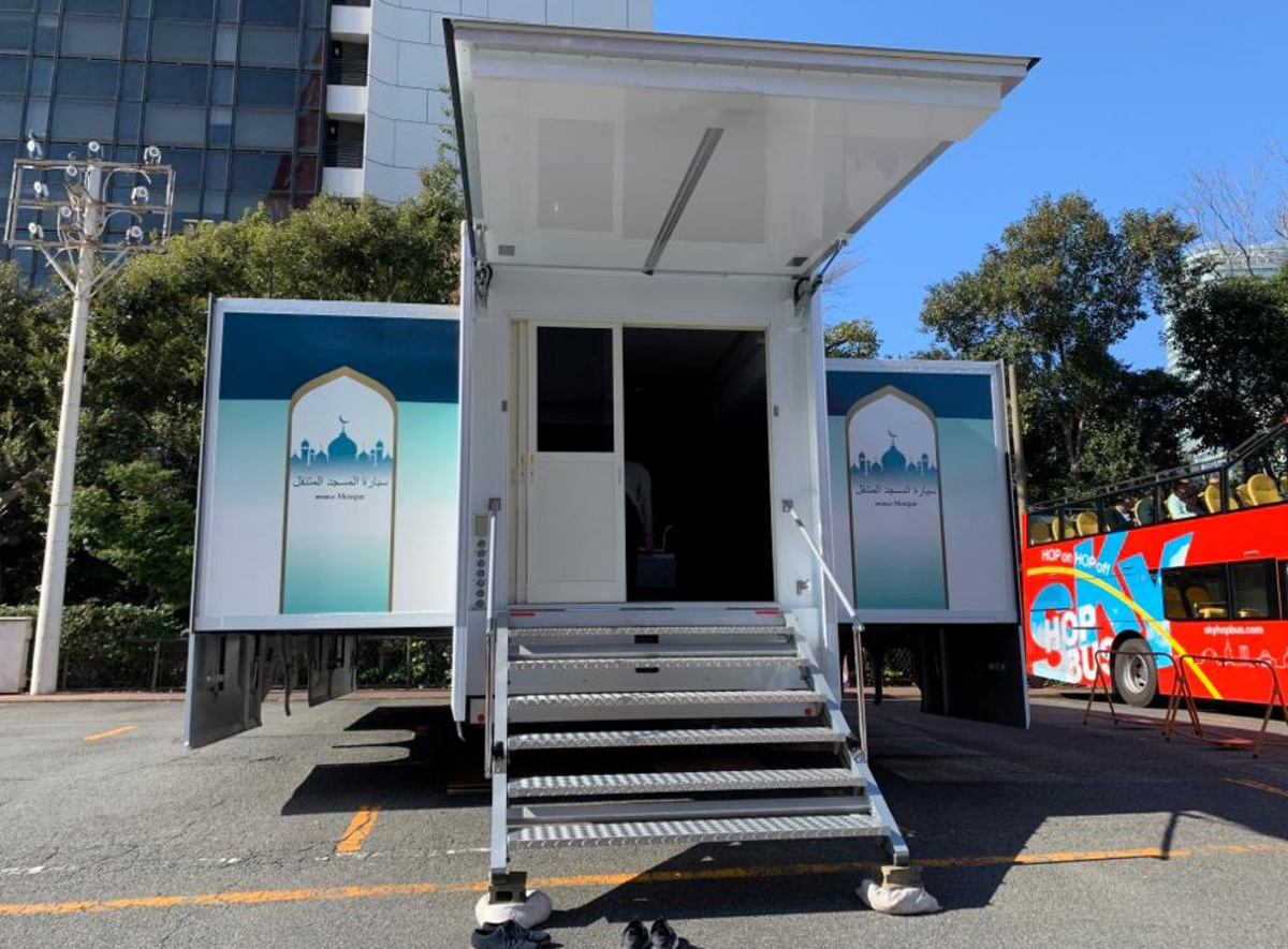 The back of the modified truck can be widened in seconds and the vehicle also includes Arabic signage and outdoor water taps for pre-worship cleaning.