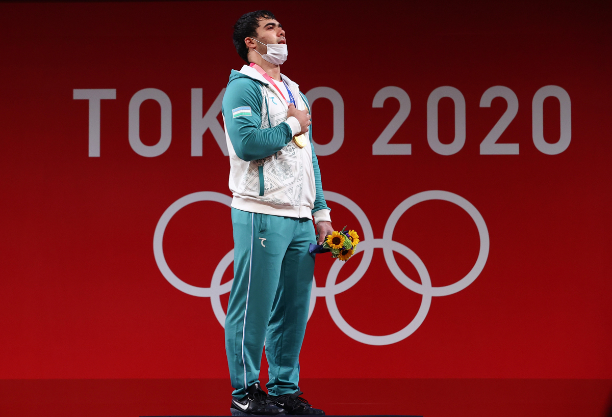 Djuraev, who earned Uzbekistan a weightlifting medal at a third successive Olympics, put his right hand on his heart as his national flag was raised during the presentation ceremony and sang the national anthem with his lips sticking out above his mask.
