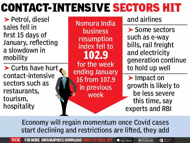 NEW DELHI: The curbs imposed by various states seem to have hurt mobility across the country, with data showing a sharp impact on movement to workplaces. But economists are confident that the Omicron wave may not dent growth significantly as some sectors are displaying signs of holding up.