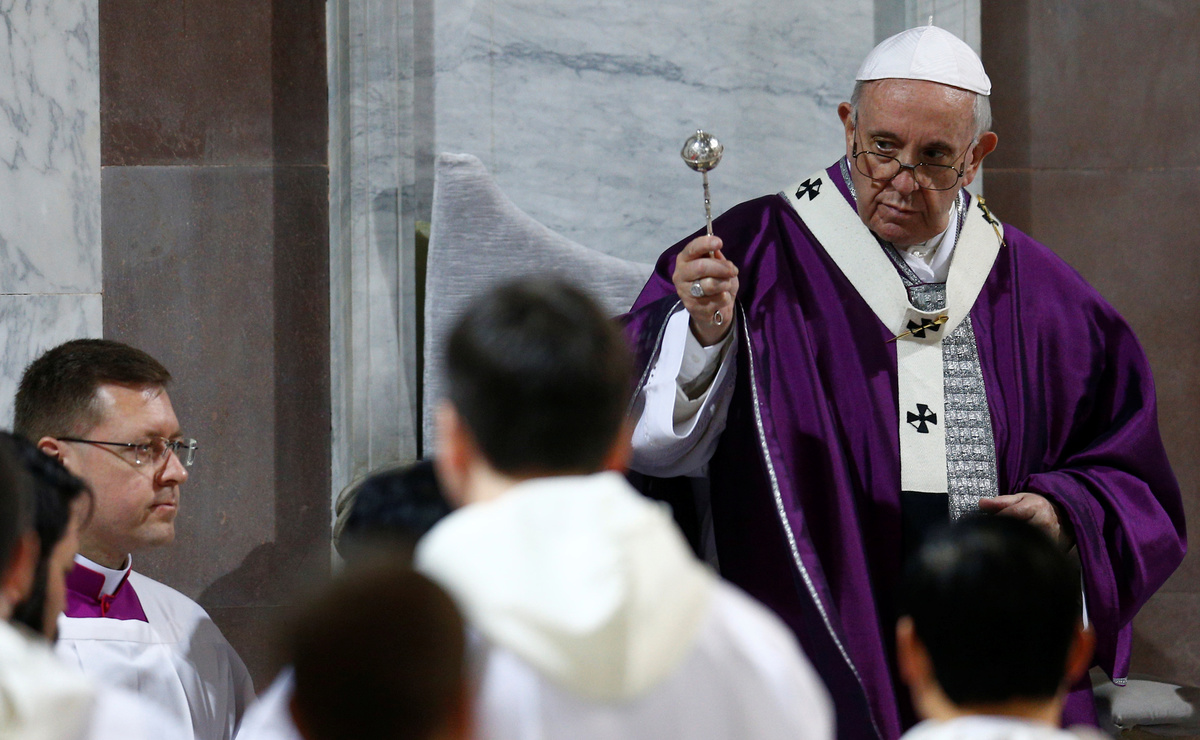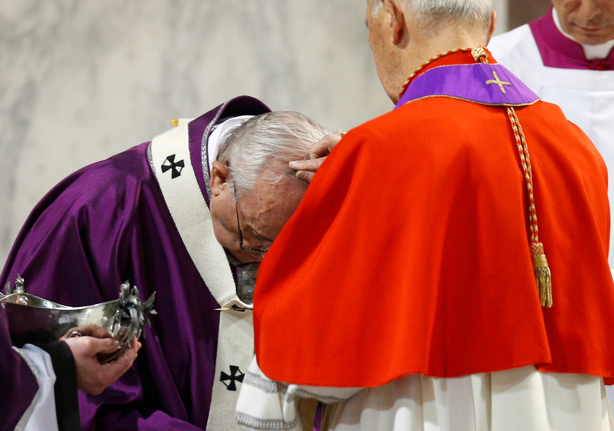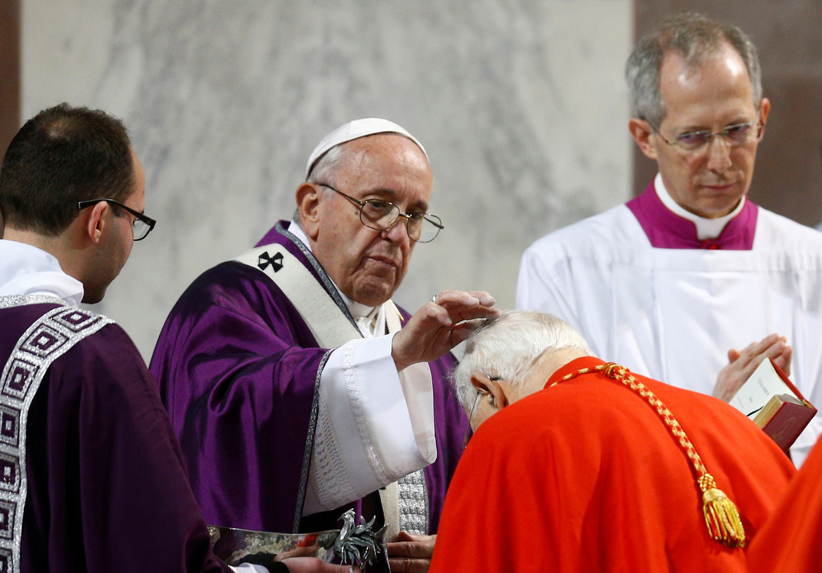 Francis led a traditional procession between two churches on Rome's Aventine Hill and later said Mass during which he had ashes rubbed onto his head by a cardinal in a rite intended to remind people of their mortality.