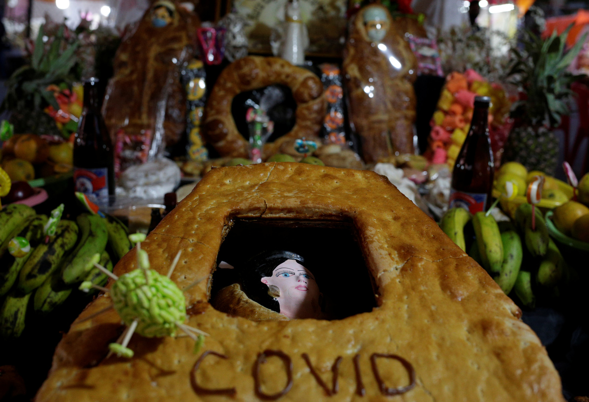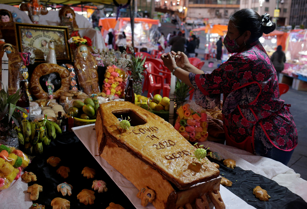 In a market in La Paz, Lourdes Vasquez has set up an altar to remember a colleague who died. It has a large, coffin-shaped loaf that says "COVID-19 2020" on it, as well as offerings of fruit, drinks and snacks.