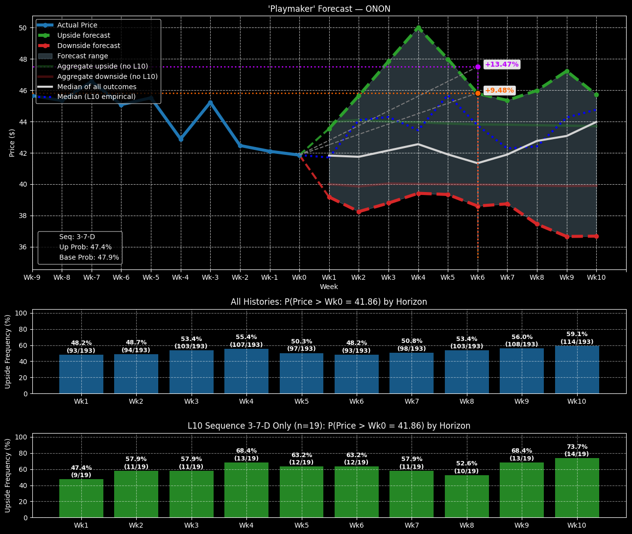 In the last 10 weeks, ONON stock has printed a 3-7-D sequence: three up weeks, seven down weeks, with an overall downward trajectory. This sequence is rare, representing only 9.84% of all identifiable patterns since On Holding’s public market debut. However, the median price of outcomes tied to the 3-7-D tends to rise above the median of all outcomes.