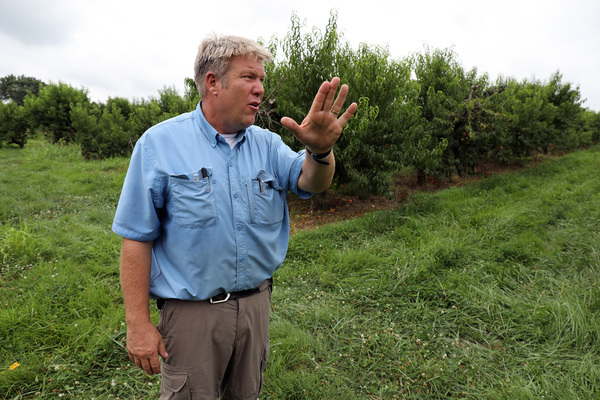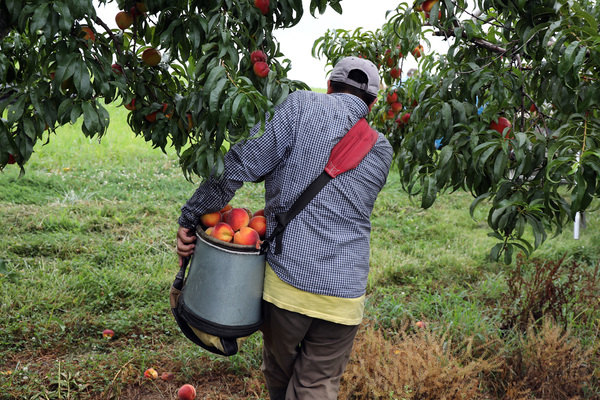 At Rendleman Farms, which has 100 acres of peaches and 90 acres of apples to harvest, aluminum ladders clang as workers carry them from tree to tree. A flotilla of dragonflies hovers in the humidity.