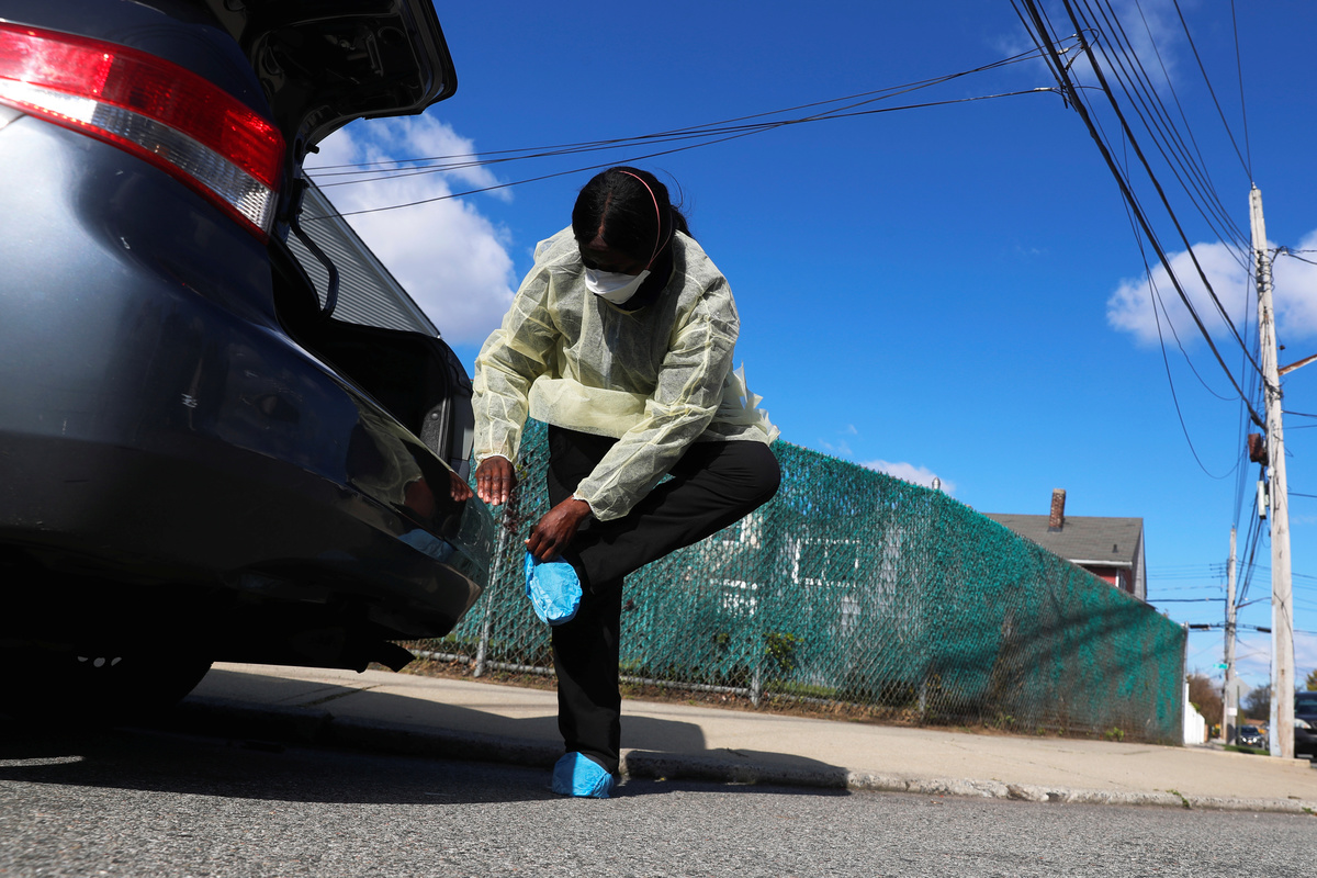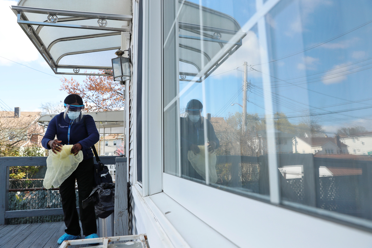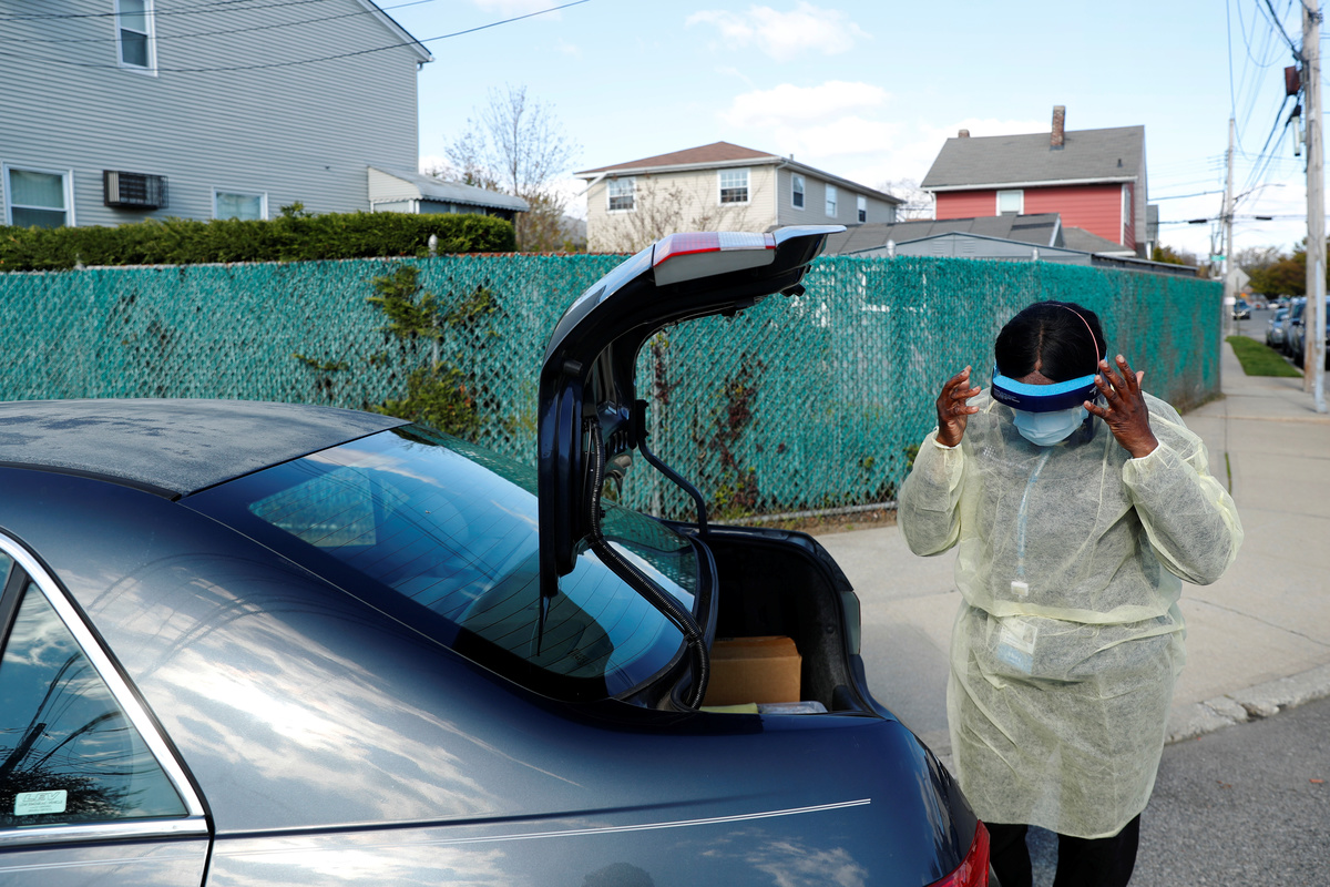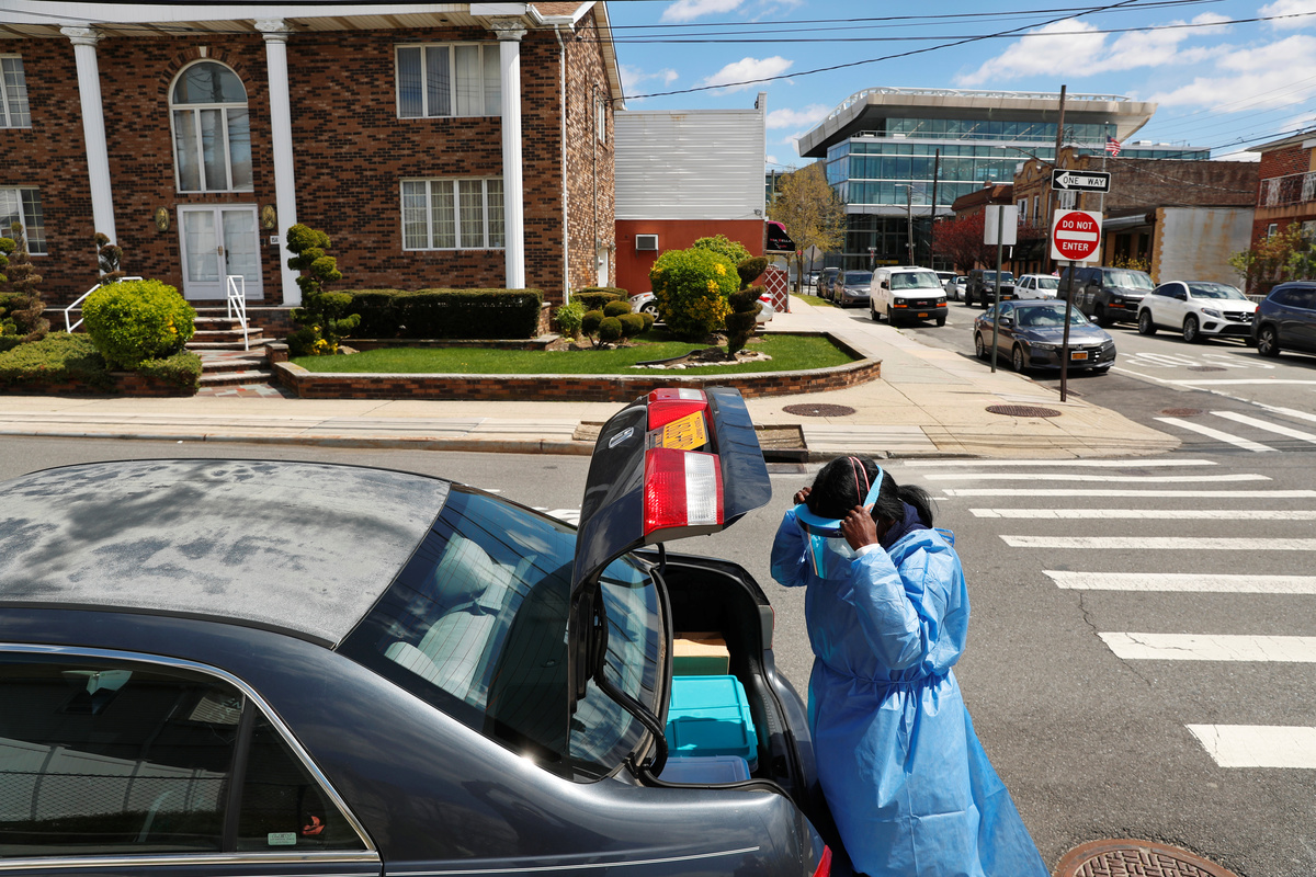 Nurse Flora Ajayi parks her car on a residential block in Queens, New York and pops open the trunk, revealing plastic bins full of personal protective gear. She dons gloves, a blue gown, two masks, a face shield and shoe covers and turns to enter the home of one of her COVID-19 patients.
