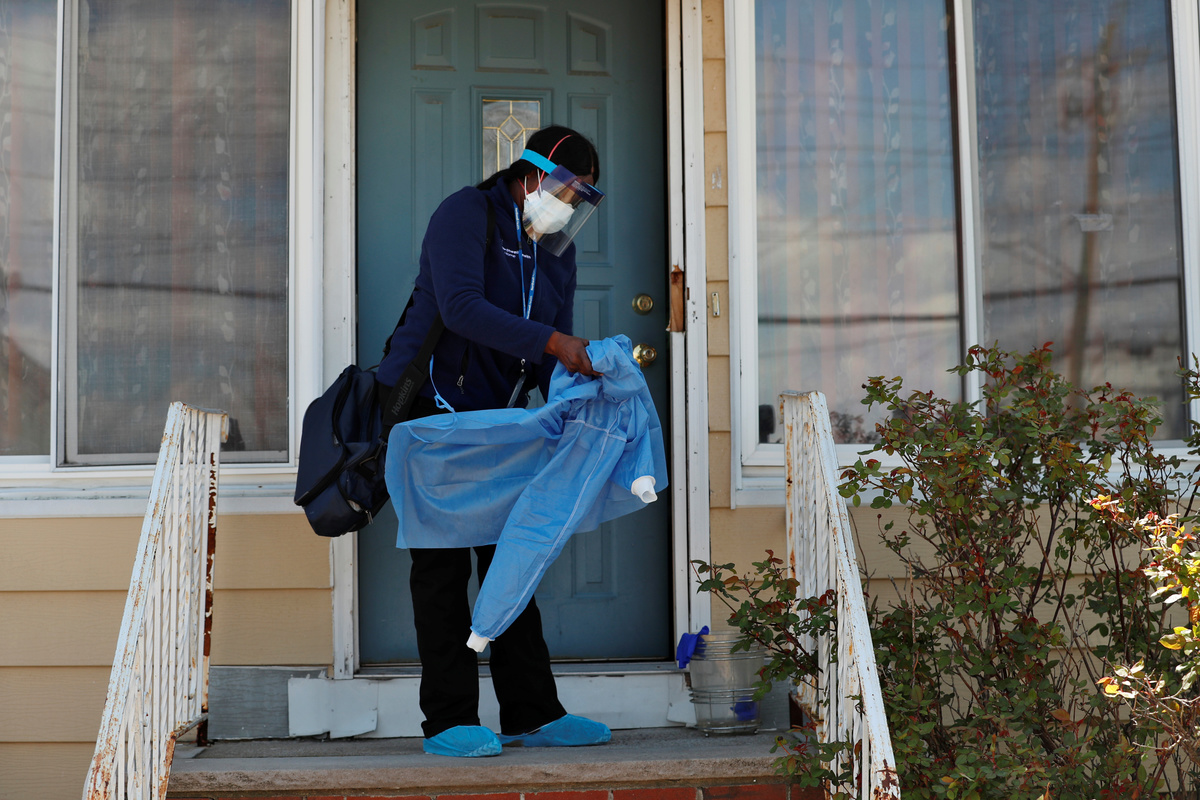 "We are also on the frontlines," Ajayi said of home care nurses, tying her gown behind her back as she prepared to enter the home of a 74-year-old woman who was recently discharged from a hospital stay with the coronavirus. "The doctors want us to be the eyes and ears."