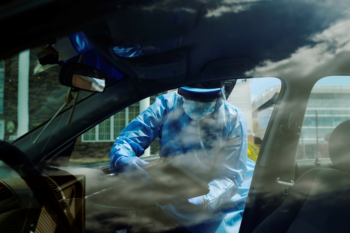 She listens to the patients’ lungs with a stethoscope for signs of fluid build-up. She reminds them to not share toiletries and to wipe down doorknobs and light switches.