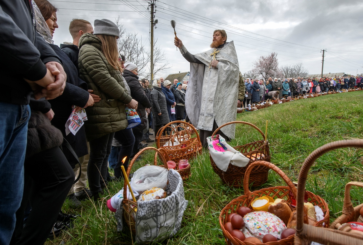 Long queues formed outside the cathedral as worshippers carrying baskets of ornately painted Easter eggs and paska, a traditional Ukrainian Easter bread, waited to receive blessings from a priest.