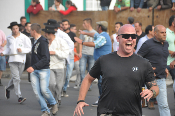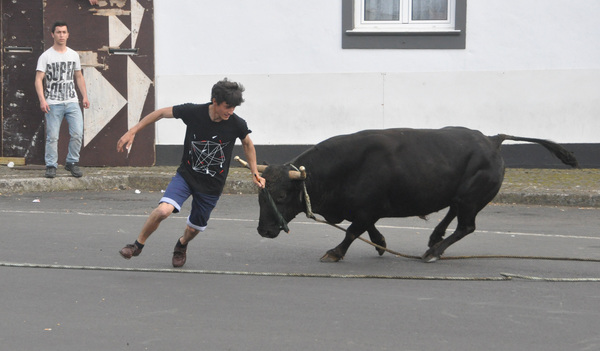 Regardless of the preliminary posturing, the cool and collected looks invariably vanish this evening in an instant. For the men (and it's all men, not a woman on the street to be seen) taking part in this Terceira village's traditional touradas a corda, translated literally as "bull on a rope," everything changes when the bull executes a 180-degree turn at the far end of the street and comes barreling at them.