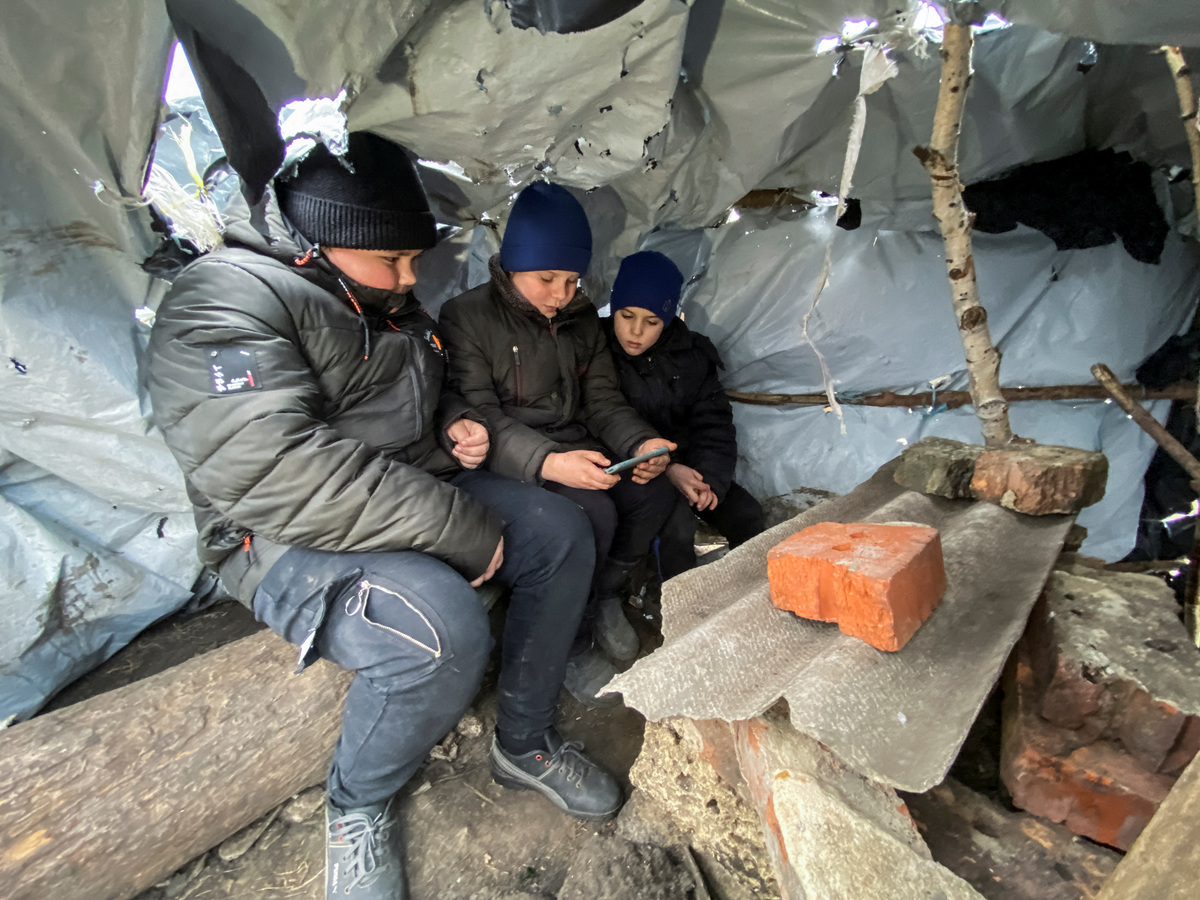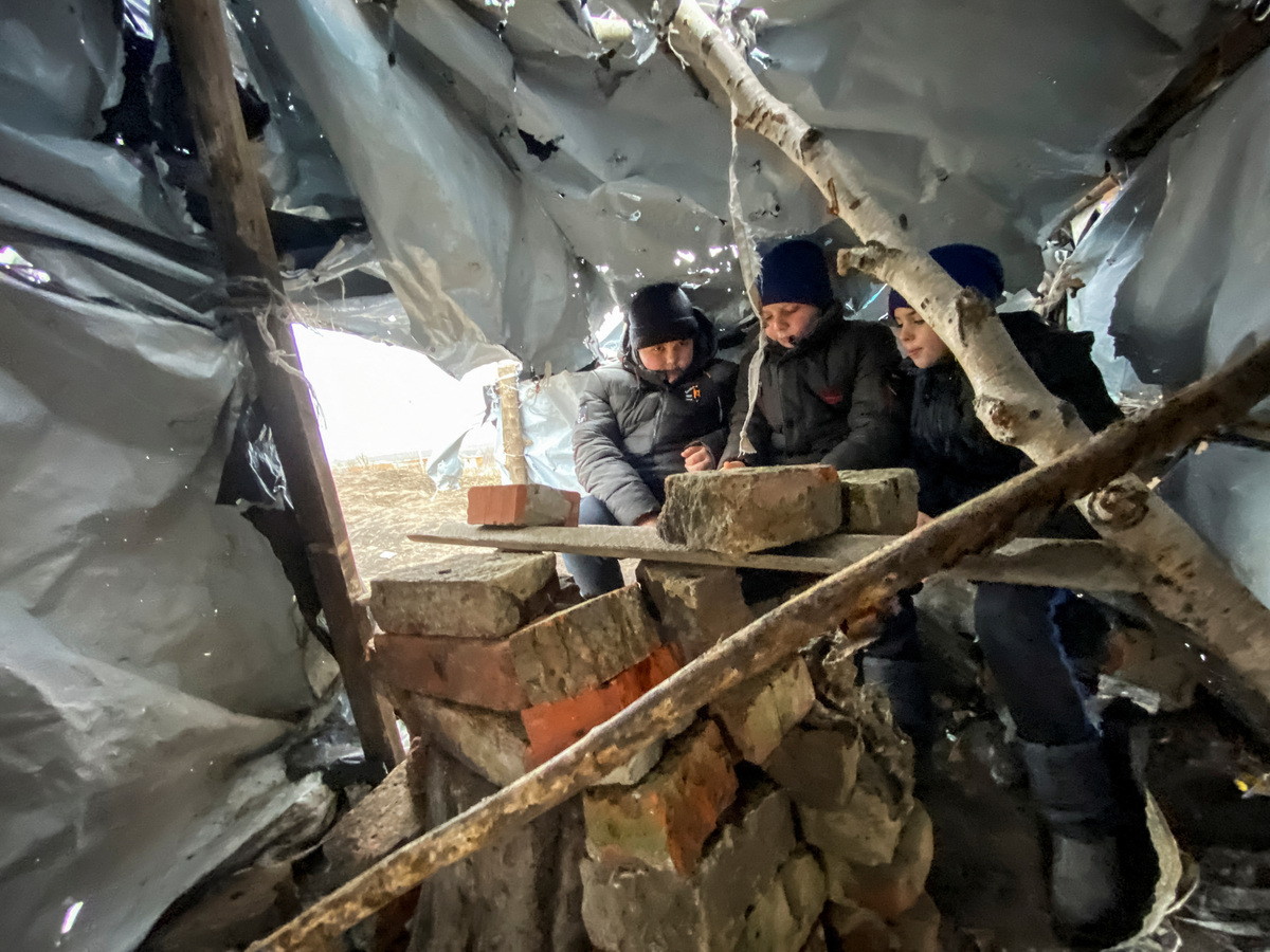 At the only place in their village where they could find a strong mobile internet signal - a windswept hill on the barren steppe - Ukrainian fifth-grader Mykola Dziuba and his friends have built makeshift tent to serve as a remote classroom.