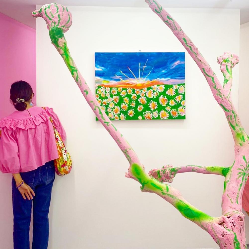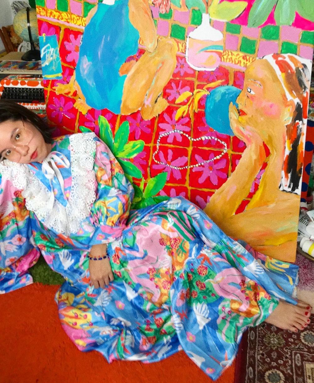 Comfortable in her skin, this quirky yet vibrant and stylishly cool painter has a huge millennial fan following due to the distinctive manner in which she addresses her topics with a child-like sense of wonder and her spirited vibe, which is reflected in her artwork.