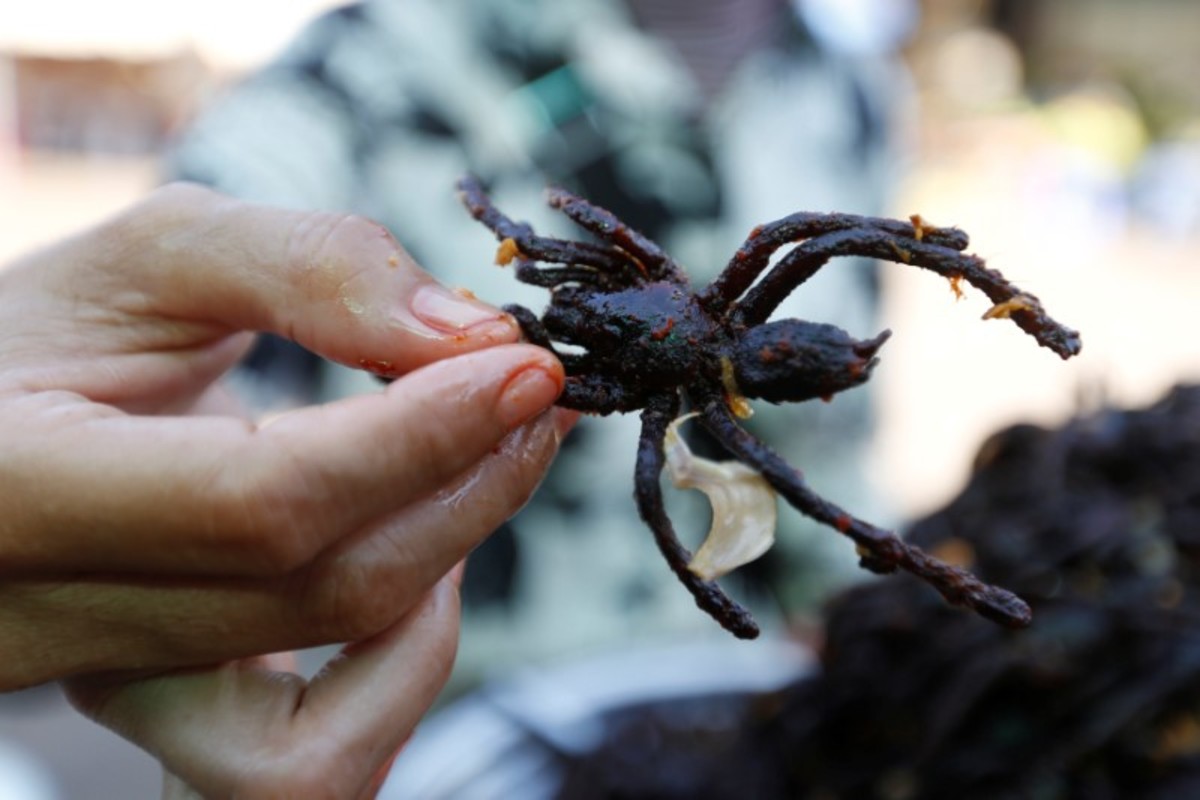 "Tarantulas are more delicious than crickets," said customer Om Kumpheak, 27, as he bit into a deep-fried spider. "I have to pass through here to buy tarantulas, because they're rare in Phnom Penh."