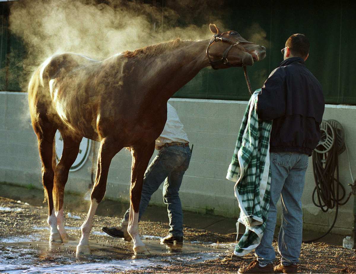 HORSE RACING - Charismatic, the Kentucky Derby and Preakness winner, is held by stable foreman John Sica as he is washed down by groom Cesar Arrendonzo after a morning workout on the track at Churchill Downs in Louisville, Kentucky.