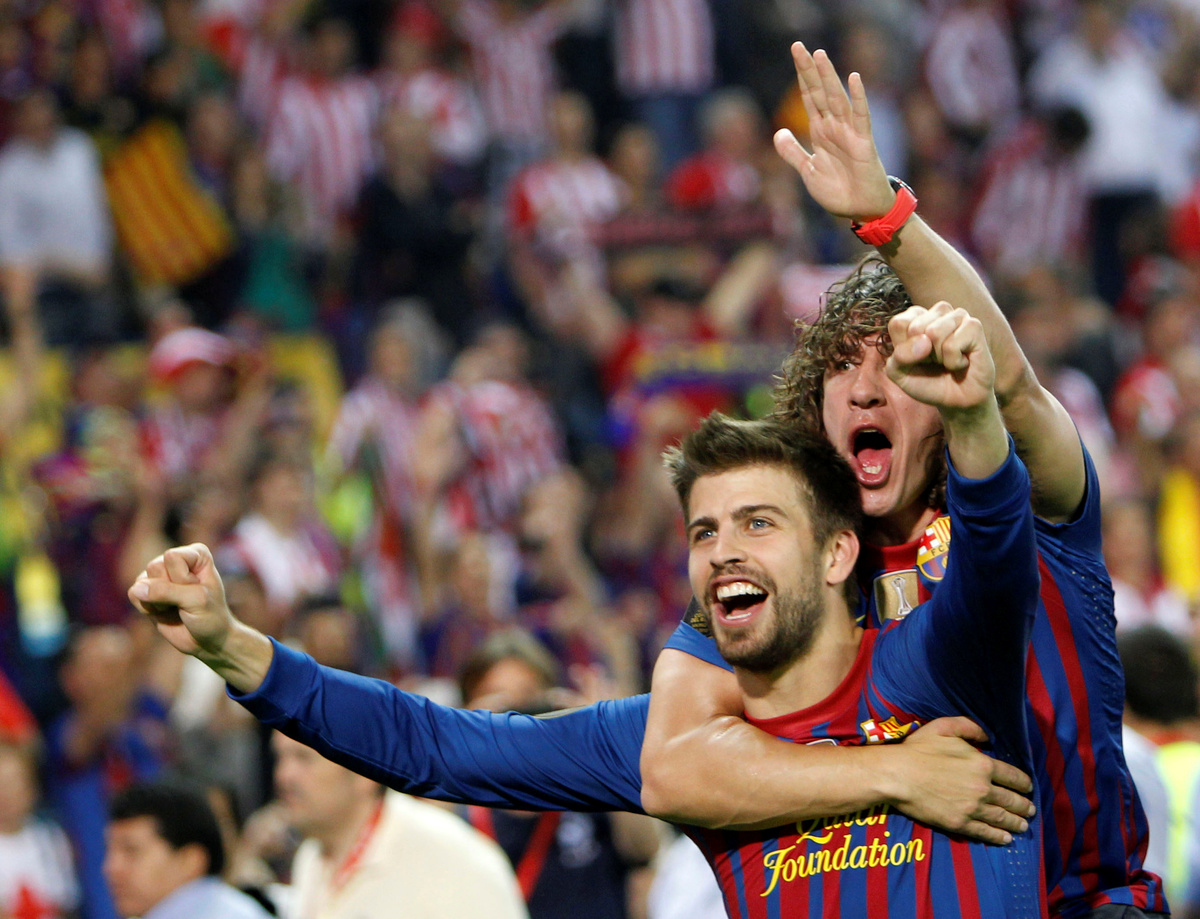 SOCCER - Barcelona's Gerard Pique and fellow defender Carles Puyol celebrate after beating Athletic Bilbao 3-0 in the King's Cup final at the Vicente Calderon stadium in Madrid.