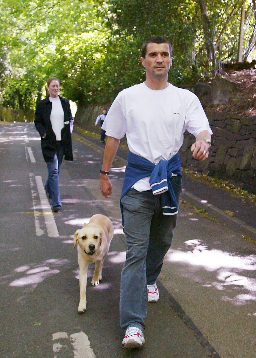 SOCCER - Ireland's captain Roy Keane walks his dog near his home in Hale, Cheshire. The fiery midfielder had been sent home from the World Cup in South Korea and Japan after a row with manager Mick McCarthy at a meeting over training facilities.