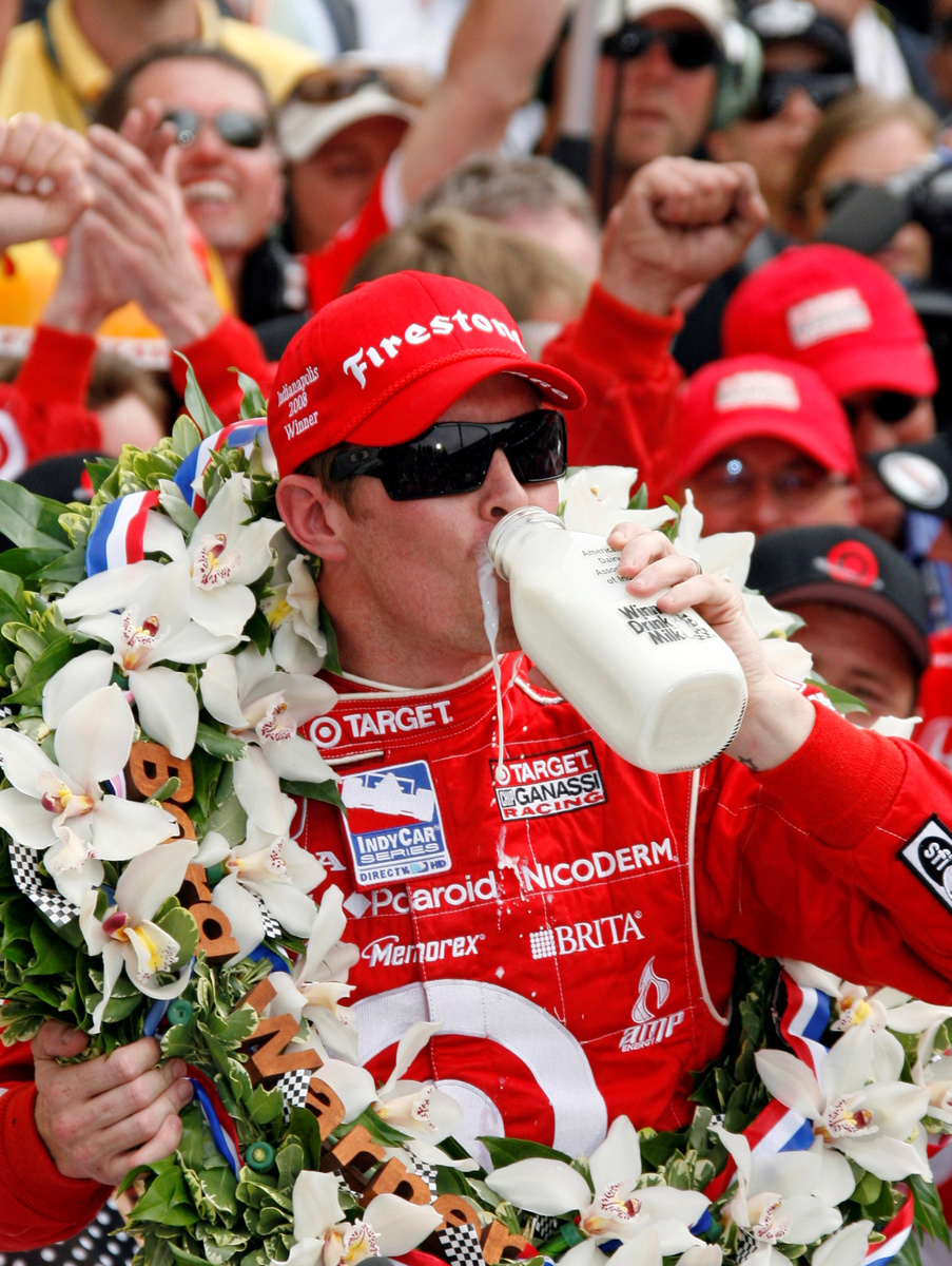 An excited Dixon was greeted in Victory Lane by his wife Emma, and then celebrated his $2.5 million win with a chug from the traditional bottle of milk.