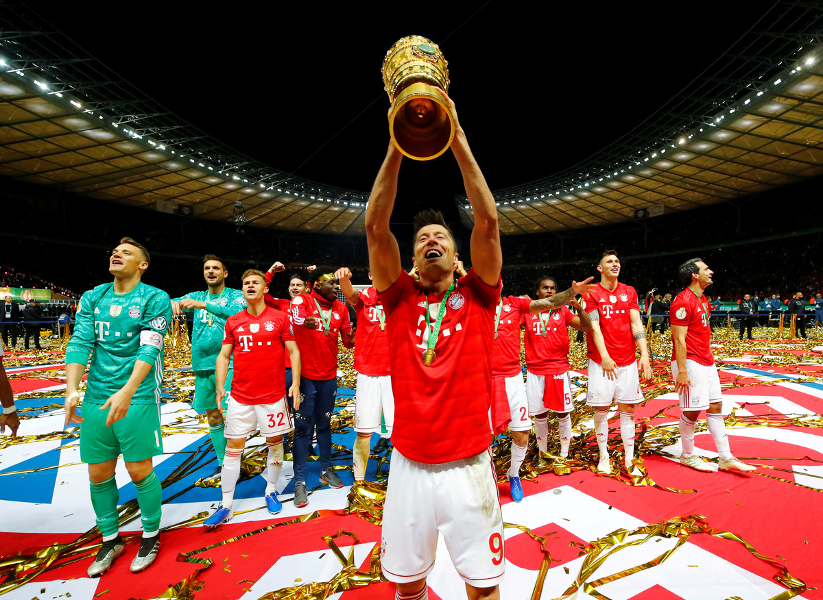 SOCCER - Bayern Munich's Robert Lewandowski and team mates celebrate winning the German Cup following a 3-0 victory over RB Leipzig in the final. Lewandowski scored twice to help Bayern capture their 19th German Cup and complete a domestic double.