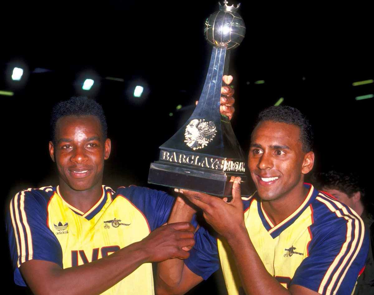 SOCCER - Arsenal's Michael Thomas and David Rocastle hold up the first division trophy following a 2-0 win over fellow title contenders Liverpool at Anfield on the last day of the 1988-89 league season.