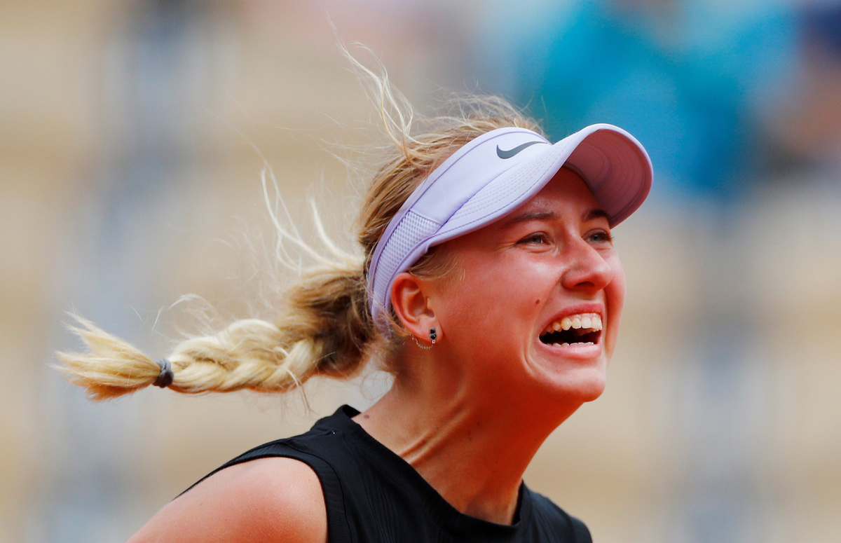 TENNIS - Russia's Anastasia Potapova celebrates defeating Germany's Angelique Kerber 6-4 6-2 on Court Philippe Chatrier in the first round of the French Open.