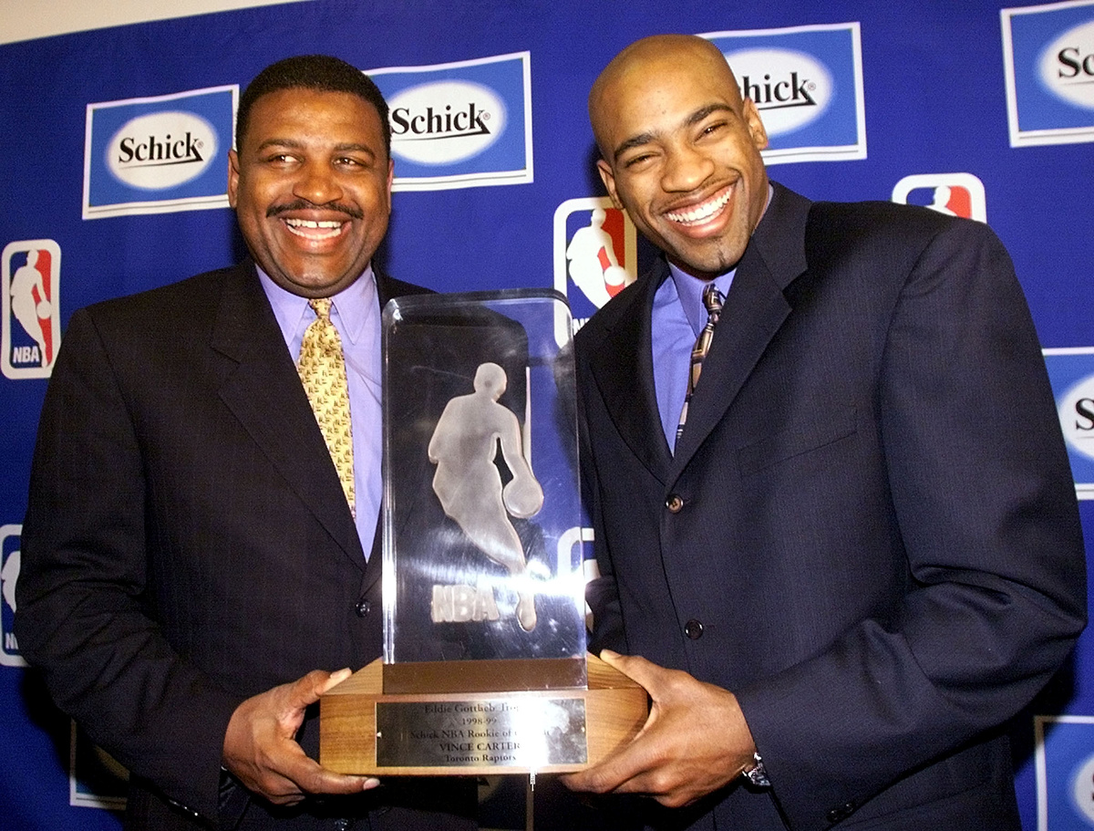 BASKETBALL - Toronto Raptors' Vince Carter with coach Butch Carter after receiving the NBA Rookie of the Year award.
