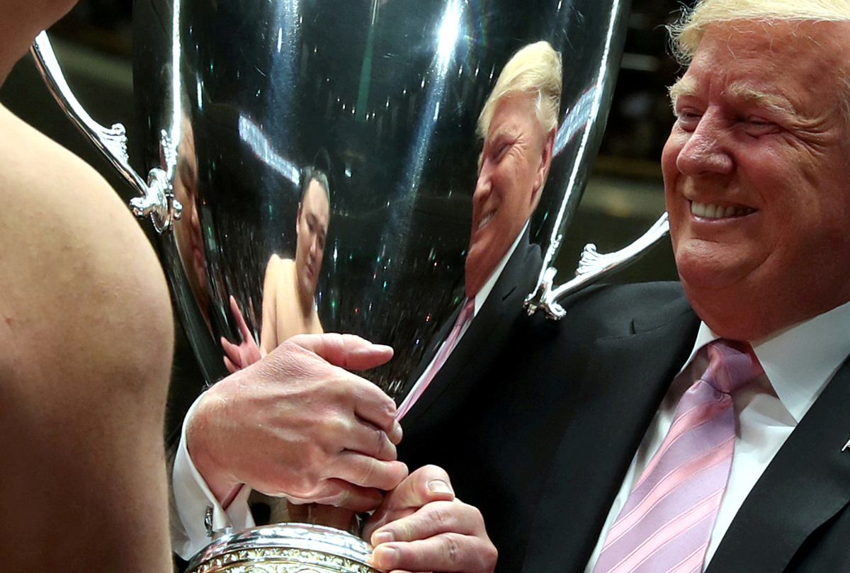 SUMO WRESTLING - United States President Donald Trump presents the President's Cup trophy to rising Japanese wrestler Asanoyama, who won a 15-day Summer Grand Sumo tournament at the Kokugikan sumo venue in Tokyo.