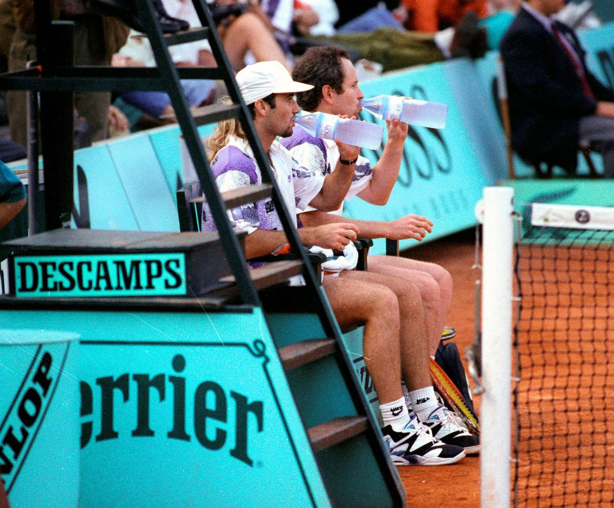 TENNIS - John McEnroe and Andre Agassi drink water during their 6-3 6-2 first-round victory against Todd Nelson and Jason Stoltenberg at the French Open.