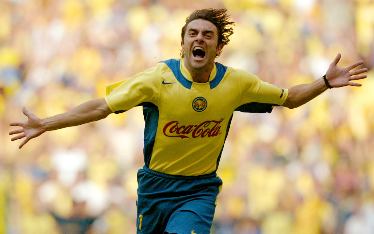 SOCCER - America striker Claudio Lopez celebrates scoring his team's second goal in a 6-3 win against Tecos in the second leg of their Mexican league championship final at the Azteca stadium.