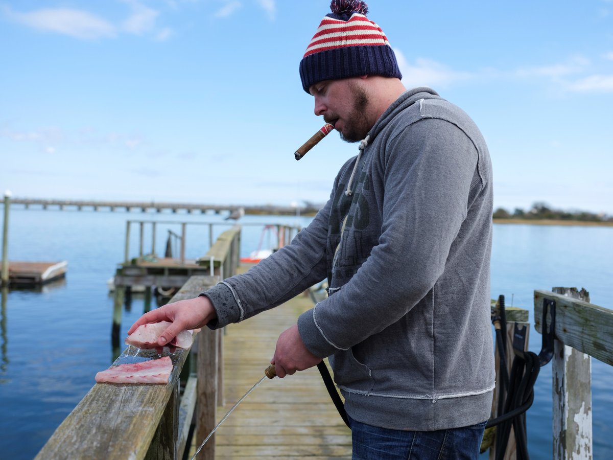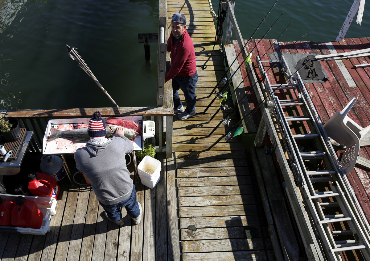 Chris Keegan prepares pieces of a Striped Bass caught during a morning fishing trip outside Keegan's home in the Broad Channel neighborhood of Queens in New York City, U.S., November 2, 2019. Picture taken November 2, 2019. REUTERS/Caitlin Ochs