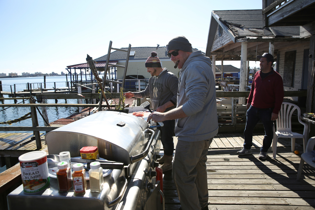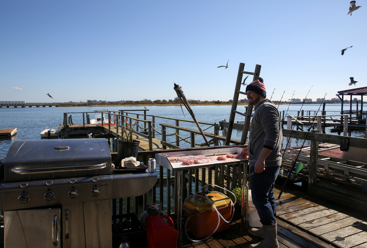 Sean Tubridy, a long time resident of Broad Channel grills Striped Bass caught during a morning fishing trip with friends Chris Keegan and Ryan Whelan, outside Keegan's home in the Broad Channel neighborhood of Queens in New York City, U.S., November 2, 2019. Picture taken November 2, 2019. REUTERS/Caitlin Ochs
