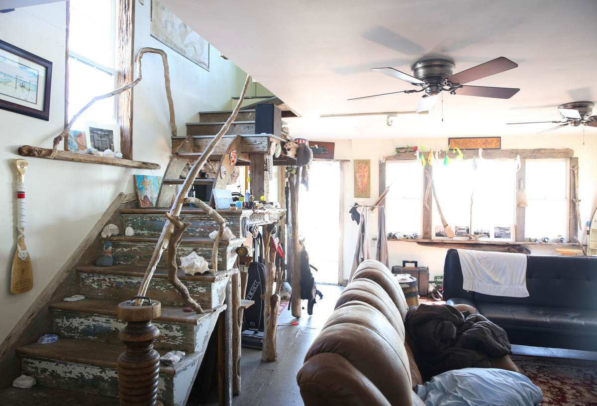 Stair railing and windows lined with driftwood that washed up over the years are seen in a house that was purchased by Chris Keegan and his brother from a family friend, despite not being able to secure flood insurance, in the Broad Channel neighborhood of Queens in New York City, U.S., November 2, 2019. Picture taken November 2, 2019. REUTERS/Caitlin Ochs