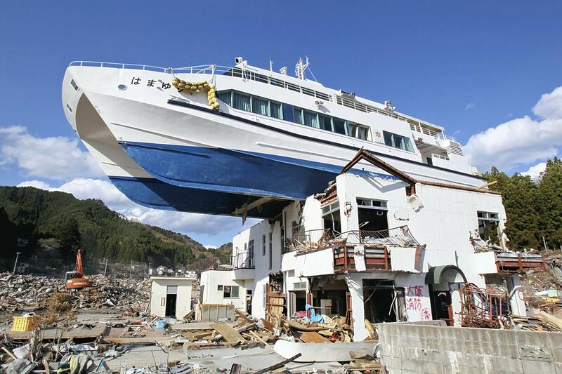 The 7-meter-tall two-story building was used as the Akabu guesthouse when the town was hit by the massive tsunami, which deposited the 27-meter-long, 109-ton Hamayuri sightseeing ship, operated by the Kamaishi city government in the prefecture, on the building's roof with only half of its hull on it. This resulting sight highlighted the tsunami's devastating impact. The ship was removed two months after the disaster out of concern of it falling from the roof.