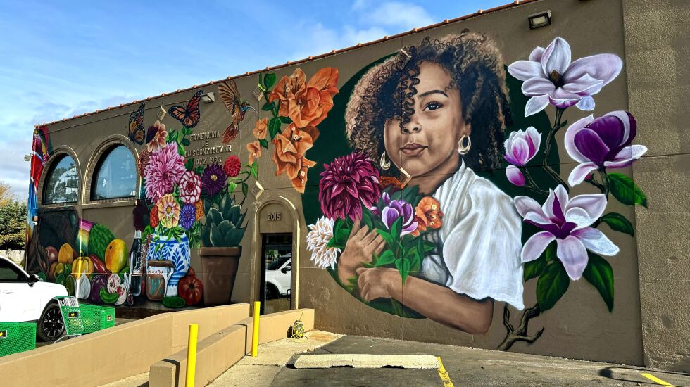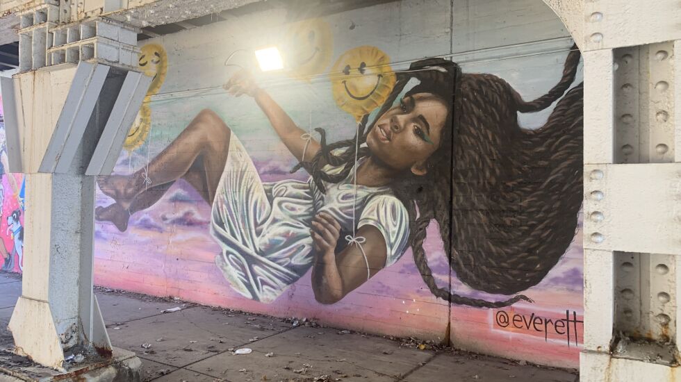 Recently, Reynolds created a mural in Waukegan featuring a girl surrounded by flowers on the side of a market, and another mural in a viaduct on the edge of Pilsen featuring a young woman being lifted into the air by balloons.