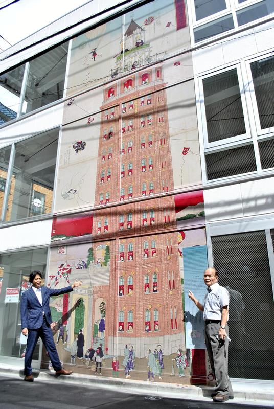 A large painting of the Ryounkaku observatory, at one time the highest building in Japan, has appeared on the wall of a newly constructed building in the Asakusa area of Taito Ward, Tokyo, where the observatory used to stand.