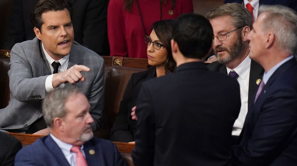 Even after two key Republican holdouts voted “present,” lowering the tally McCarthy would have needed, it was not enough. He strode to the back of the chamber to confront Rep. Matt Gaetz, sitting with Rep. Lauren Boebert and other holdouts. Fingers were pointed, words exchanged and violence apparently just averted.