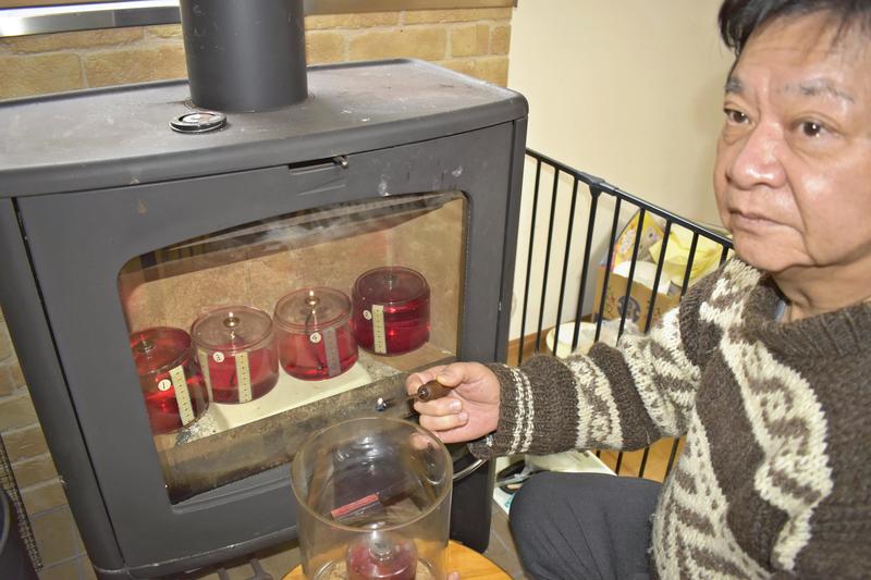 First, Takao prepared items for keeping the fire lit. He had four lamps specially order-made, each of which can hold one liter of oil, and placed the lamps inside a wood stove.