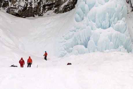 A rescue crew was dispatched to the 40m tall Vilyuchinsky waterfall in the Kamchatka peninsula after four people were reported to have become trapped after the chunk of ice fell on Thursday, Russia's Emergencies Ministry told the Tass news agency.