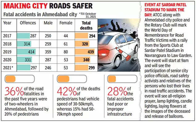 AHMEDABAD: From January 1 to October 31, the city traffic police recorded deaths of 299 persons as 945 persons sustained injuries in road traffic accidents (RTA), averaging nearly one death and three injured daily on city roads.