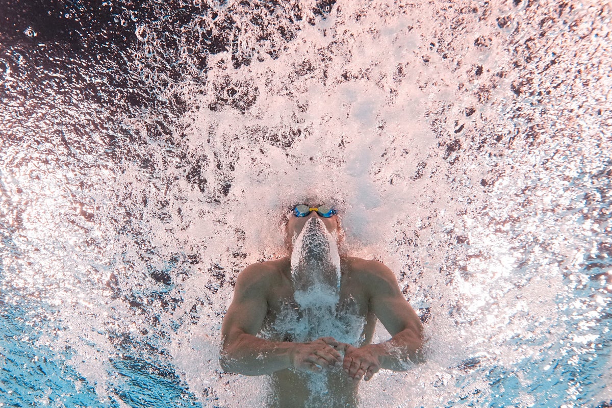 The goggles worn by Tomoru Honda, of Japan, pop out as he comes to the surface for his first butterfly stroke during the men’s 200-meter heat.