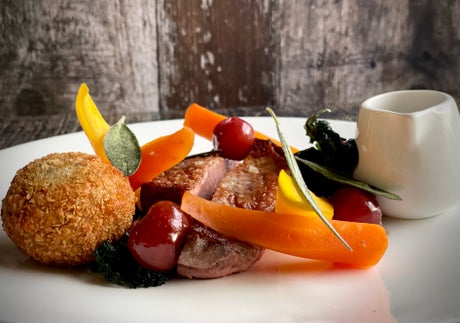 I had opted for the vegetarian options from the May menu: whipped Ashlynn goats’ cheese with a heritage beetroot salad to start; tamarind roasted aubergine with barbecued tender stem broccoli, pak choi and satay sauce, for main; and for dessert an elderflower creme with champagne poached strawberries, and a meringue and oat crunch. My housemate had the chicken terrine to start, Gressingham duck breast for main, and roasted white chocolate cheesecake with salted caramel to finish.