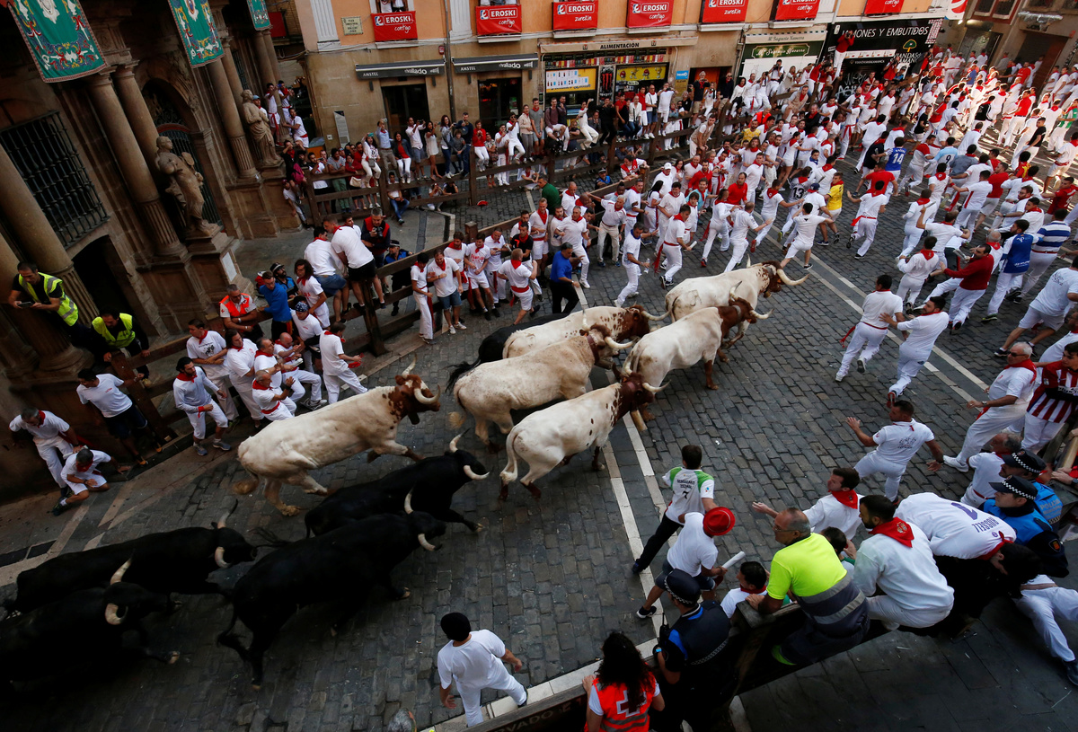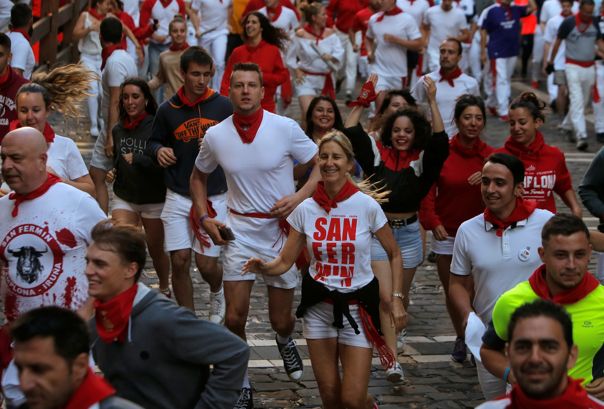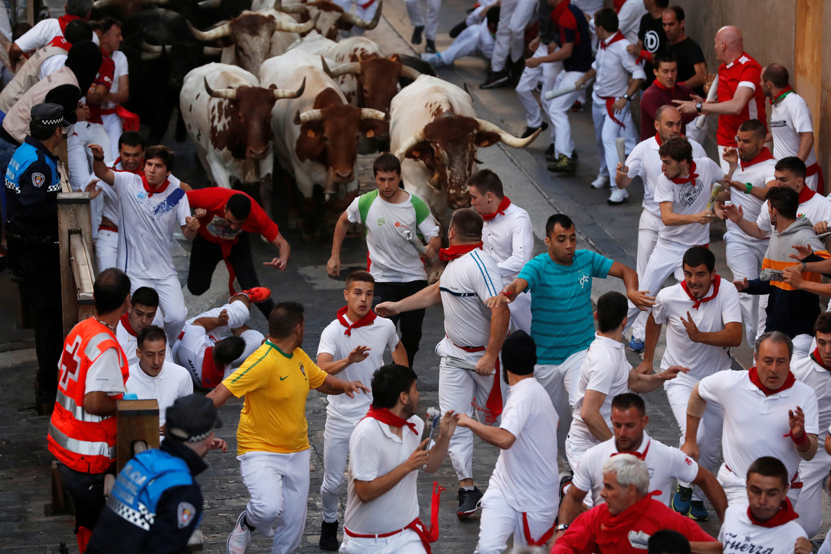 On each morning of the week-long festival, hundreds of people, many wearing white shirts with red scarves, line the narrow streets at 8 a.m. (0600 GMT) to run from the bulls who head to a ring where they are killed later.
