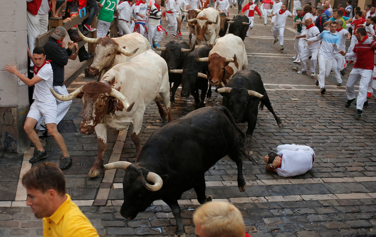 One of those was badly gored, with the official festival web site publishing an image of a bull thrusting its horn into his forearm as two steers trampled over him on the floor while another man also lay underneath and other people rushed by.