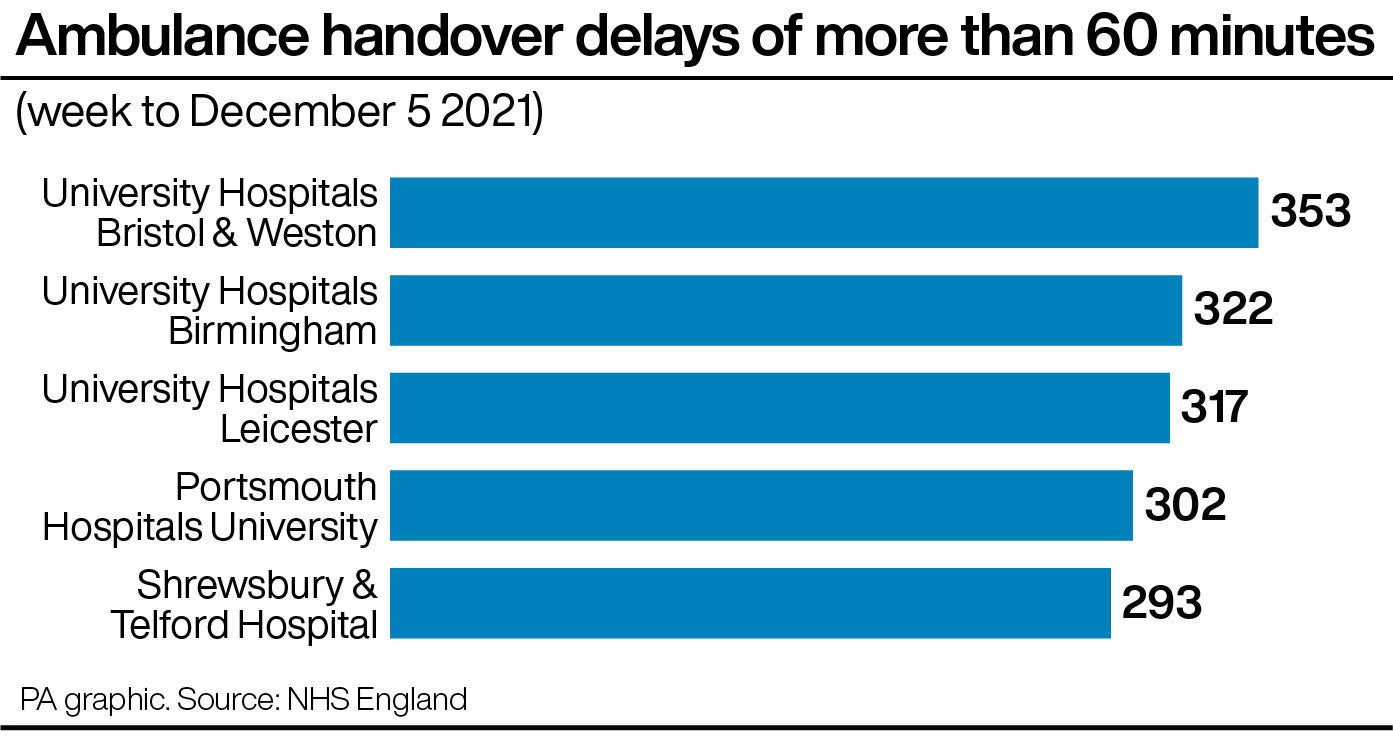 Analysis of the figures by the PA news agency showed that University Hospitals Bristol & Weston Foundation Trust reported the highest number of delays of more than 60 minutes (353), followed by University Hospitals Birmingham Foundation Trust (322) and University Hospitals of Leicester Trust (317).