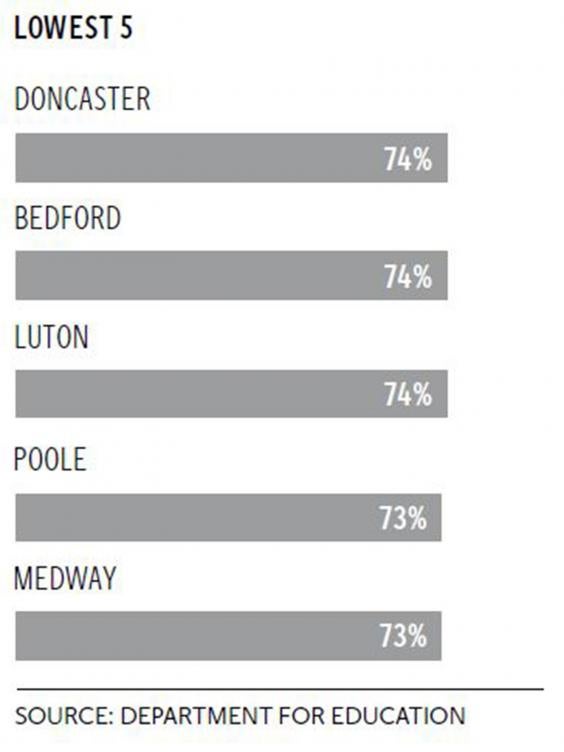 In 23 areas, every primary school is reaching this target; in others around one in seven schools are not. Doncaster, Central Bedfordshire and Wakefield have the highest proportions of underperforming schools.