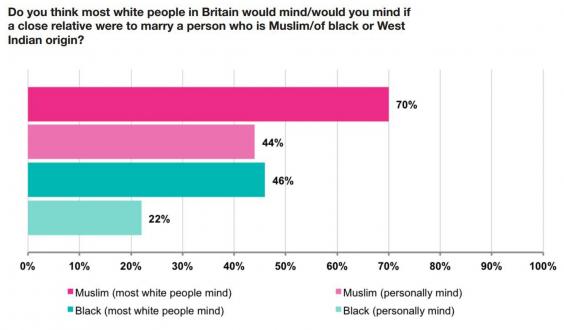 A staggering 70 per cent of respondents also said that “most white British people” would mind if a close relative married a Muslim, with 44 per cent saying they would mind themselves - far above the proportion who admitted racial prejudice.