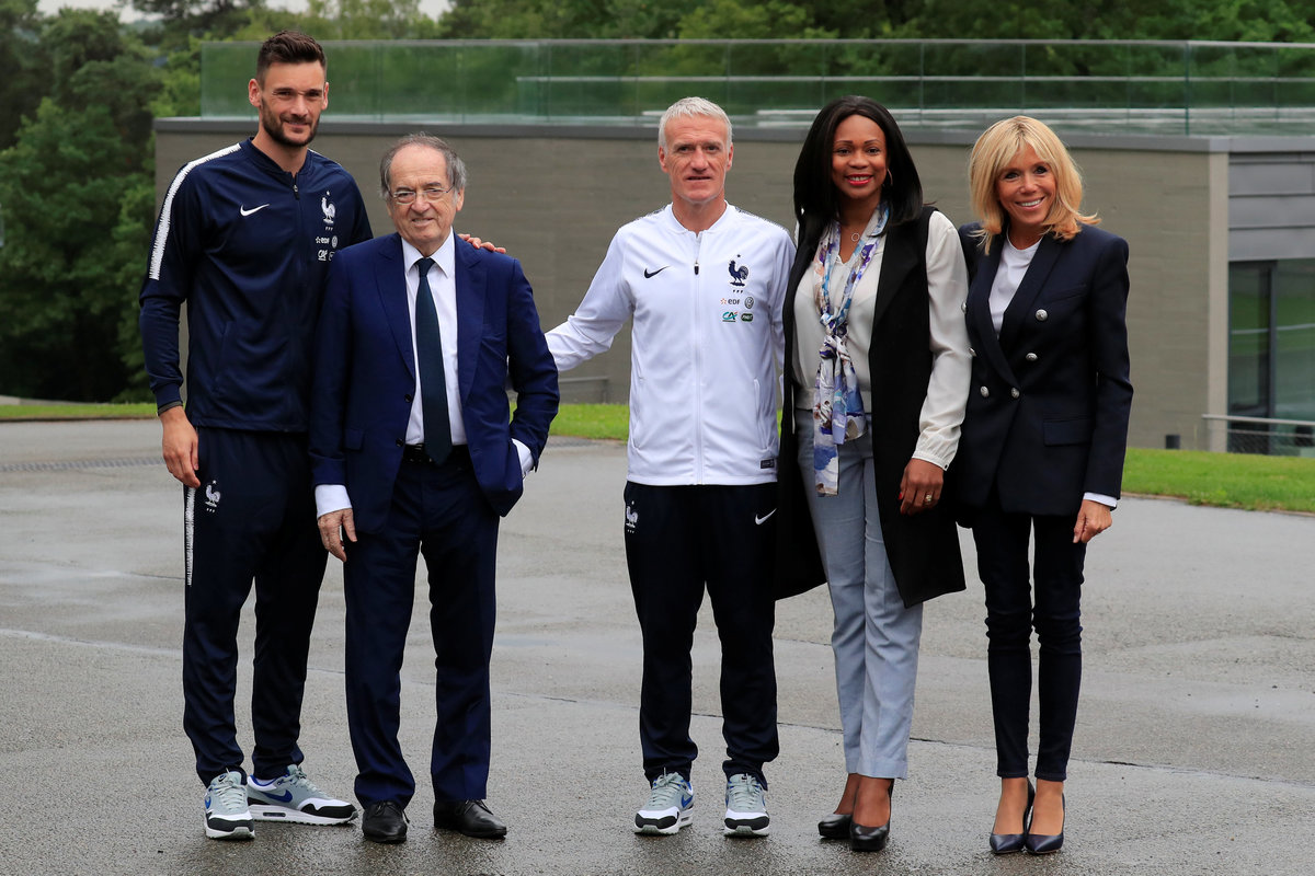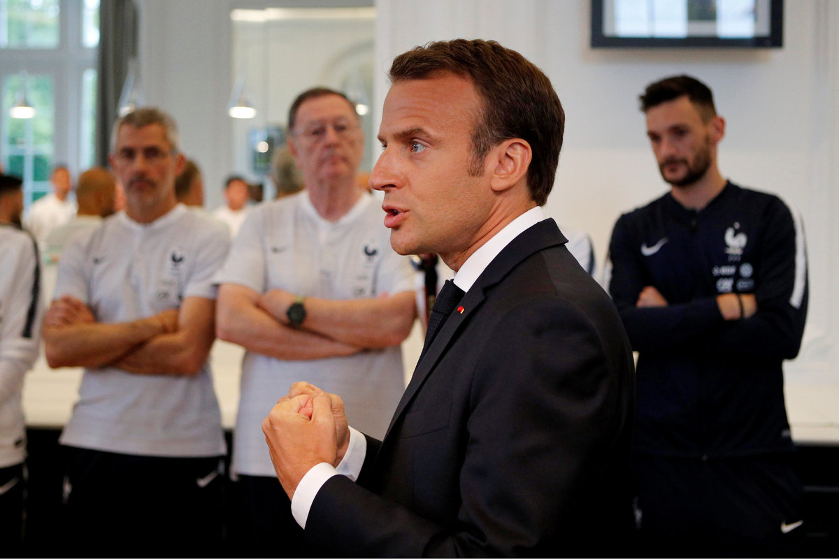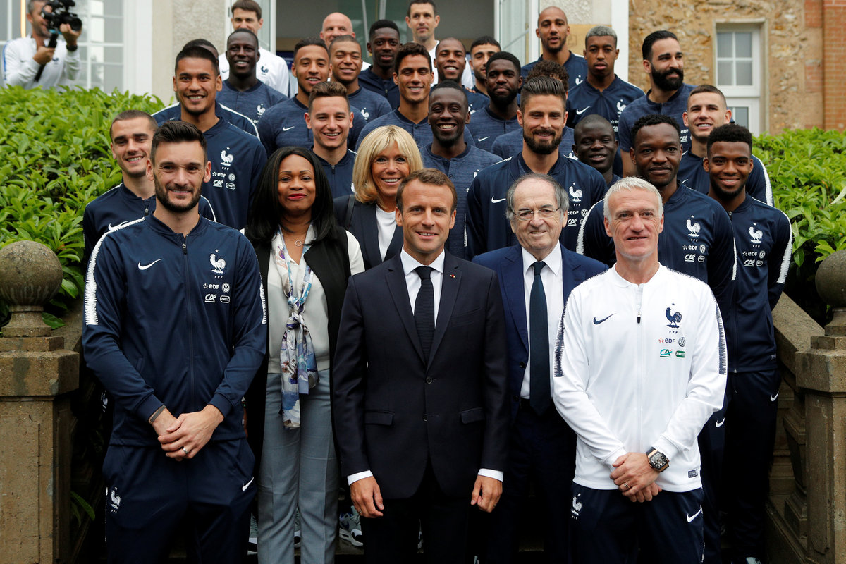 France coach Didier Deschamps, Hugo Lloris, French Sports Minister Laura Flessel and French Football Federation President Noel Le Graet wait for the arrival of French President Emmanuel Macron at the French national football team training center in Clairefontaine near Paris, France, June 5, 2018 prior to the national team's participation to the 2018 FIFA World Cup Russia. REUTERS/Gonzalo FuentesFrench President Emmanuel Macron (C) and his wife, Brigitte Macron, pose for a group photo with the French national soccer team upon their arrival for lunch at France's training camp in Clairefontaine, near Paris, France, June 5, 2018 prior to the national team's participation to the 2018 FIFA World Cup Russia. Francois Mori/Pool via ReutersFrench national soccer team head coach Didier Deschamps waits for the arrival of French President Emmanuel Macron (not pictured) during a meeting at France's training camp in Clairefontaine, near Paris, France, June 5, 2018 prior to the national team's participation to the 2018 FIFA World Cup Russia. Francois Mori/Pool via Reuters?Brigitte Macron, the wife of French President Emmanuel Macron pose with France coach Didier Deschamps, French Sports Minister Laura Flessel and French Football Federation President Noel Le Graet at the French national football team training center in Clairefontaine near Paris, France, June 5, 2018 prior to the national team's participation to the 2018 FIFA World Cup Russia. REUTERS/Gonzalo FuentesFrench President Emmanuel Macron (R), acknowledges applause with French national soccer team players during a meeting at France's training camp in Clairefontaine, near Paris, France, June 5, 2018. Standing with Macron, from left to right, head coach Didier Deschamps, French minister of sport, Laura Flessel, Brigitte Macron and French Football Federation President Noel Le Graet. Francois Mori/Pool via ReutersMacron speaks to the French national soccer team players, as goalkeeper Hugo Lloris (L), his wife, Brigitte Macron (2ndR) and head coach Didier Deschamps (R) look on during a meeting at France's training camp in Clairefontaine, near Paris, France, June 5, 2018 prior to the national team's participation to the 2018 FIFA World Cup Russia. Francois Mori/Pool via Reuters French national soccer goalkeeper Hugo Lloris reacts as he delivers his speech to French President Emmanuel Macron (not pictured) during a meeting at France's training camp in Clairefontaine, near Paris, France, June 5, 2018 prior to the national team's participation to the 2018 FIFA World Cup Russia. Francois Mori/Pool via ReutersFrench President Emmanuel Macron, speaks to the French national soccer team head coach Didier Deschamps as his wife, Brigitte Macron looks on during a meeting at France's training camp in Clairefontaine, near Paris, France, June 5, 2018 prior to the national team's participation to the 2018 FIFA World Cup Russia. Francois Mori/Pool via Reuters?Brigitte Macron, wife of French President Emmanuel Macron, shakes hands with French national soccer player Kylian Mbappe, upon her arrival with her husband for lunch at France's training camp in Clairefontaine, near Paris, France, June 5, 2018 prior to the national team's participation to the 2018 FIFA World Cup Russia. Francois Mori/Pool via Reuters