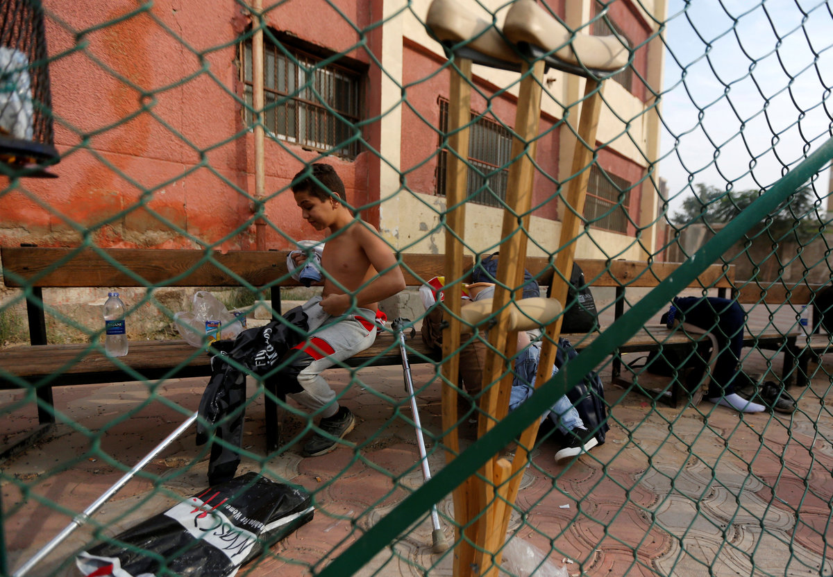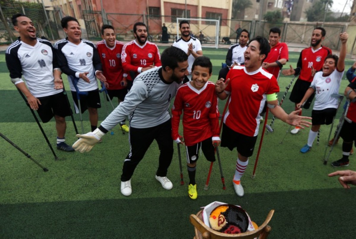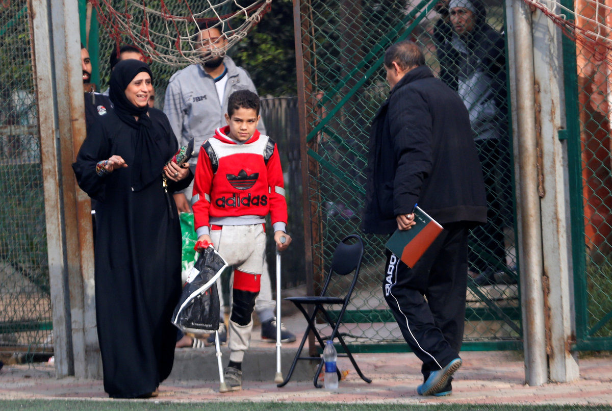 Mahmoud Tawfik, 28, captain of "Miracle Team", a soccer team made up of one-legged, crutch-bearing soccer players, kicks the ball during a training session at El Salam club on the outskirts of Cairo, Egypt December 29, 2017. REUTERS/Amr Abdallah DalshMembers of "Miracle Team", a soccer team made up of one-legged, crutch-bearing soccer players, celebrate with Saief Omar (C) on his 13th birthday before a training session at El Salam club on the outskirts of Cairo, Egypt December 29, 2017. REUTERS/Amr Abdallah DalshNour Eldin Ahmed, 12, a member of "Miracle Team", a soccer team made up of one-legged, crutch-bearing soccer players, puts on his clothes before his training session at El Salam club on the outskirts of Cairo, Egypt December 29, 2017. REUTERS/Amr Abdallah DalshNour Eldin Ahmed, 12, a member of "Miracle Team", a soccer team made up of one-legged, crutch-bearing soccer players, arrives with his mother at a training session at El Salam club on the outskirts of Cairo, Egypt December 29, 2017. REUTERS/Amr Abdallah DalshKhaled Hassan, coach of "Miracle Team", made up of one-legged, crutch-bearing soccer players, speaks to his team before a training session at El Salam club on the outskirts of Cairo, Egypt December 29, 2017. REUTERS/Amr Abdallah Dalsh