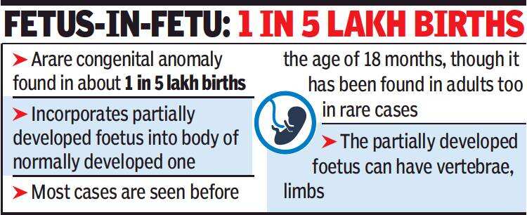MUMBAI: City doctors have successfully operated on a baby boy who was born with his ‘twin’ inside his abdomen — a rare condition called ‘fetus-in-fetu’. It is estimated to occur in one of 5 lakh live births.