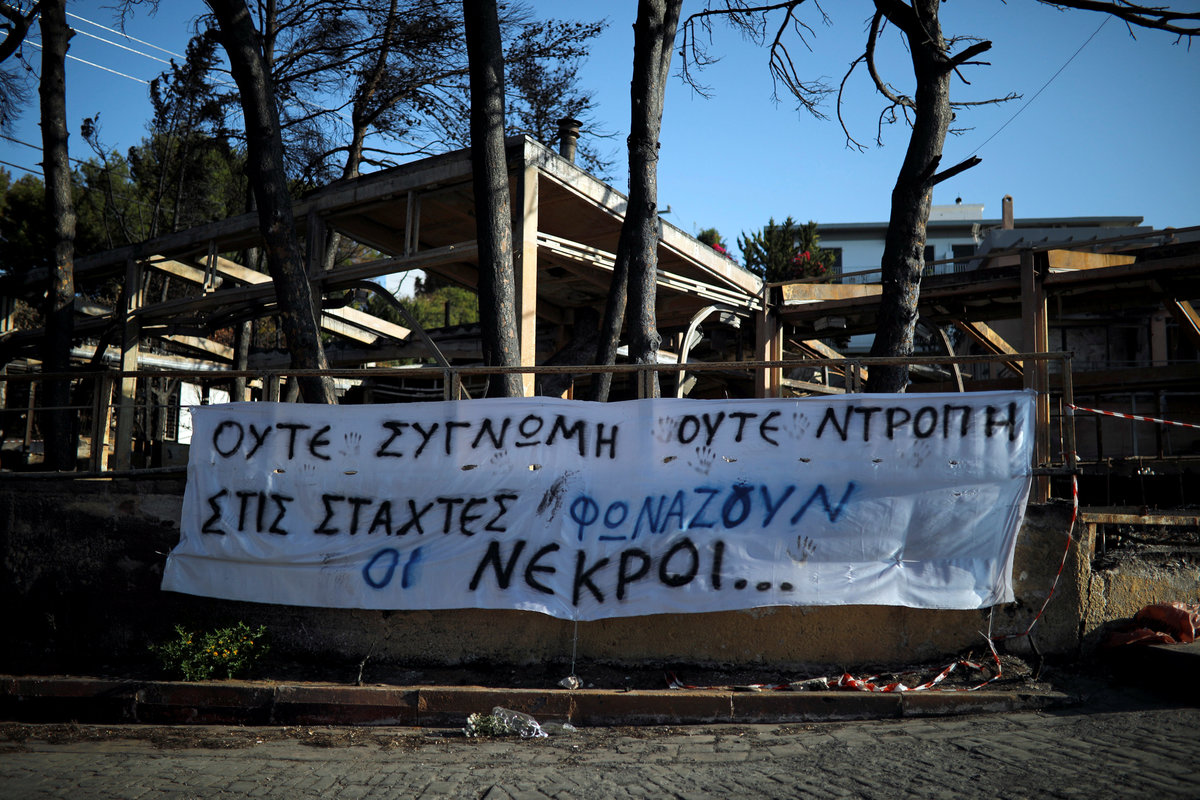 Flowers are laid in front of a banner reading "No apology, no shame, the dead are crying out from the ashes" in the village of Mati, near Athens, Greece, August 22, 2018. Picture taken August 22, 2018. REUTERS/Alkis Konstantinidis